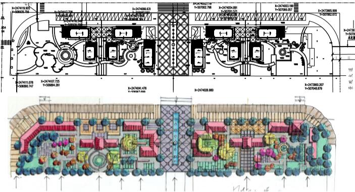在設(shè)計地塊中心是一長條形的旱噴景觀,是游園主要的景觀節(jié)點(diǎn),達(dá)到吸引人群,增強(qiáng)空間氛圍,是休閑市民進(jìn)入商場的主要廊道。 地塊兩側(cè)分別設(shè)置三五處活動節(jié)點(diǎn),為前來游園的人提供開放、半私密、及私密空間,功能上有商業(yè)空間、 休閑空間、娛樂空間等,用自由的曲線道路把各個景觀節(jié)點(diǎn)有效得聯(lián)系起來。