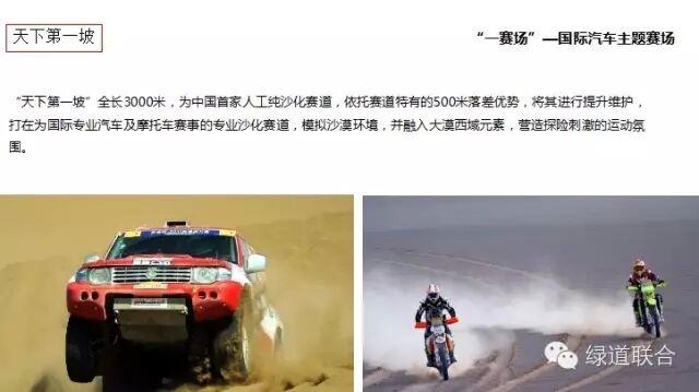 生態(tài)觀光綠道、初級(jí)體驗(yàn)賽道、天下第一坡、國(guó)際越野賽道、品牌試駕基地、賽事觀看場(chǎng)館等。